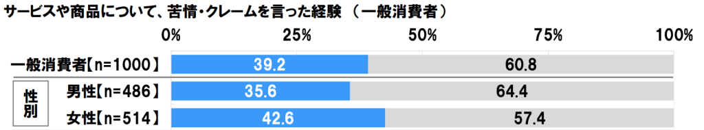 - 消費者行動に関する調査から、全体の39.2%がクレーム経験あり。