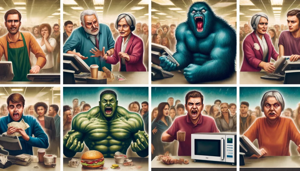 - 電子レンジが使えないことに腹を立てて金を投げる客。