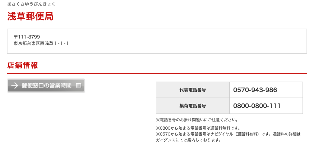 浅草郵便局の連絡先が出てくるので、そこに電話するか住所に従って直接クレームを言うようにしましょう。